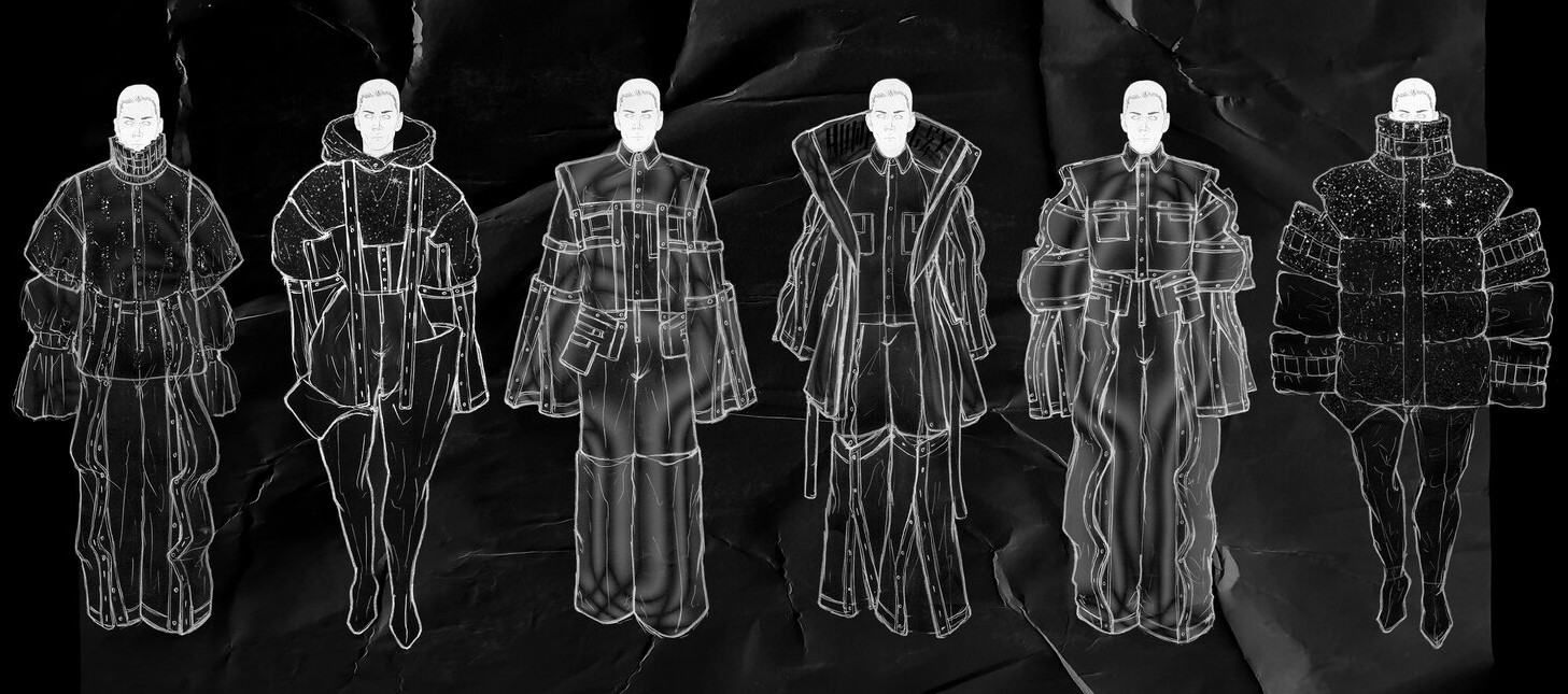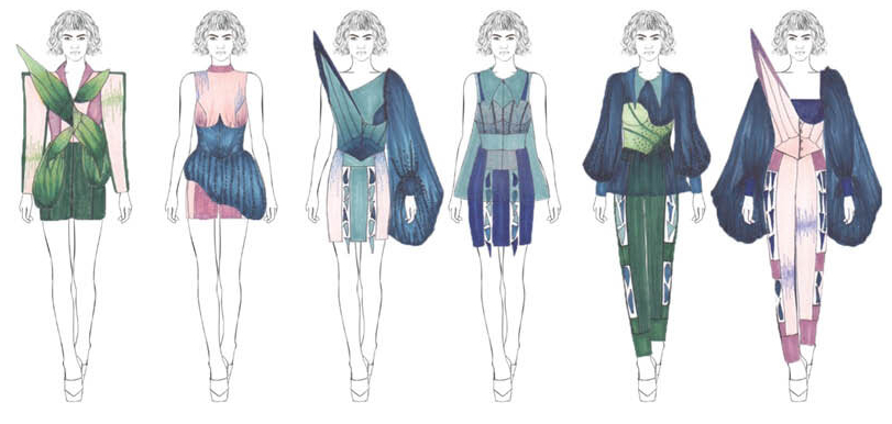 Phang is obviously a lover of anime. The entirely weird concept of the collection looks exactly like a real life version of Kantai Collection known as KanColle (艦これ, KanKore). The story line has cute girls who somehow turn into ocean-going battleships to fight off their enemies. While the underlying concept is completely daft, Phang’s work is some of the most interesting of the graduates. The designer hopes that future research and technological development will be able to turn his “fantasies into functionality”. The collection features a mix of form-fitting bodysuits as the basis for a series of layered pieces that add various functions to an outfit, like a coat, shirt and even a currently needed accessory, the face mask. It is also interesting that although his collection is placed firmly in the future, the fabrics used are more traditional like a Prince of Wales check in menswear fabric, showing that this guy really knows how to cut and fit a garment. It will be interesting to see how his work translates commercially.