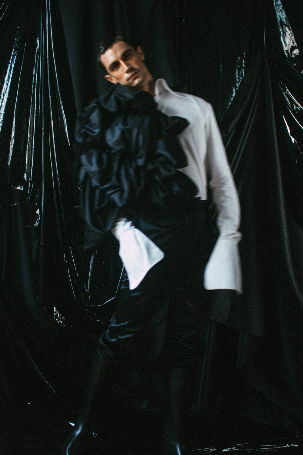 Inspired by his personal medical issue, a diagnosis of Wolff Parkinson White (WPW) Syndrome, that causes random heart palpitations, this collection is one of the more personal. The translation into a series of voluminous, non-gendered garments, however, seems to have little connection. It is hard to see the link between a backless jumpsuit, a cloak of bunched red vinyl and a white shirt with long cuffs as “an abstract form of a journal – penning and scribbling down what I felt when the palpitations attack”, as the designer writes. Presumably the shapes and volumes are how the designer translates his feelings. Whatever the connections, the pieces themselves are well tailored, pretty evening wear for the non-gendered.