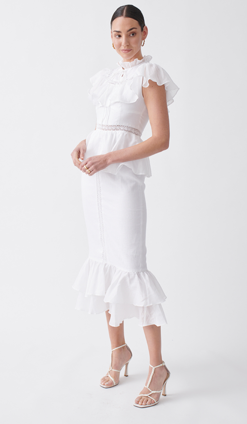 The Leo & Lin look can kind of be described as something a boho princess would wear. Fabrics range from silk-linen mixes, lace, linens, and spandex, and the pricing is firmly in the contemporary range with dresses costing from around AU$400 up to AU$700 or more depending on the materials used.