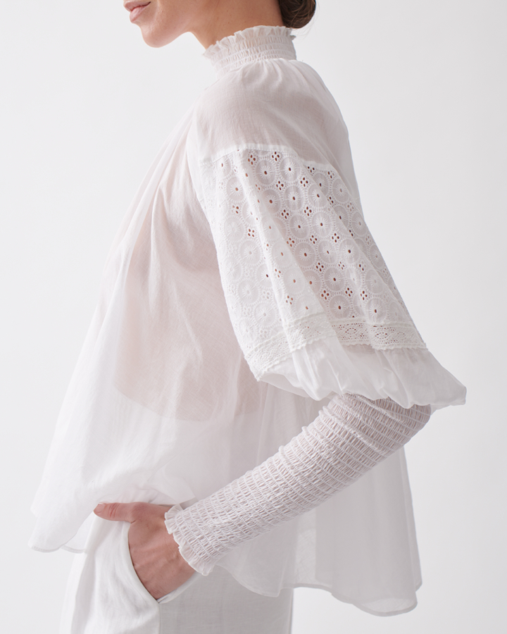 The brand’s fabrics are a glorious explosion of all things delicate and beautiful – organza, tulle, lace, silk, silk-jersey, and Broderie Anglaise. Peachy pinks, white, soft lilacs and greys are offset with black and white in the current season’s colour palette for Spring Summer 2020. Quality detailing and manufacturing ensure the clothes are beautifully made with a sense of timeless handcraft about them.